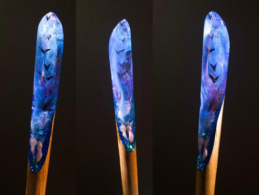 "As soon as I saw this hairstick that reminded me of a melting sun ablaze in the sky, I just admired it, I emailed Eliza and Rustam to tell them how beautiful their work was and purchased it. They are so quick with response, and bleed kindness they sure put a smile on my face here in Texas all the way from Ireland! This will not be my last purchase. I love my hairstick!"