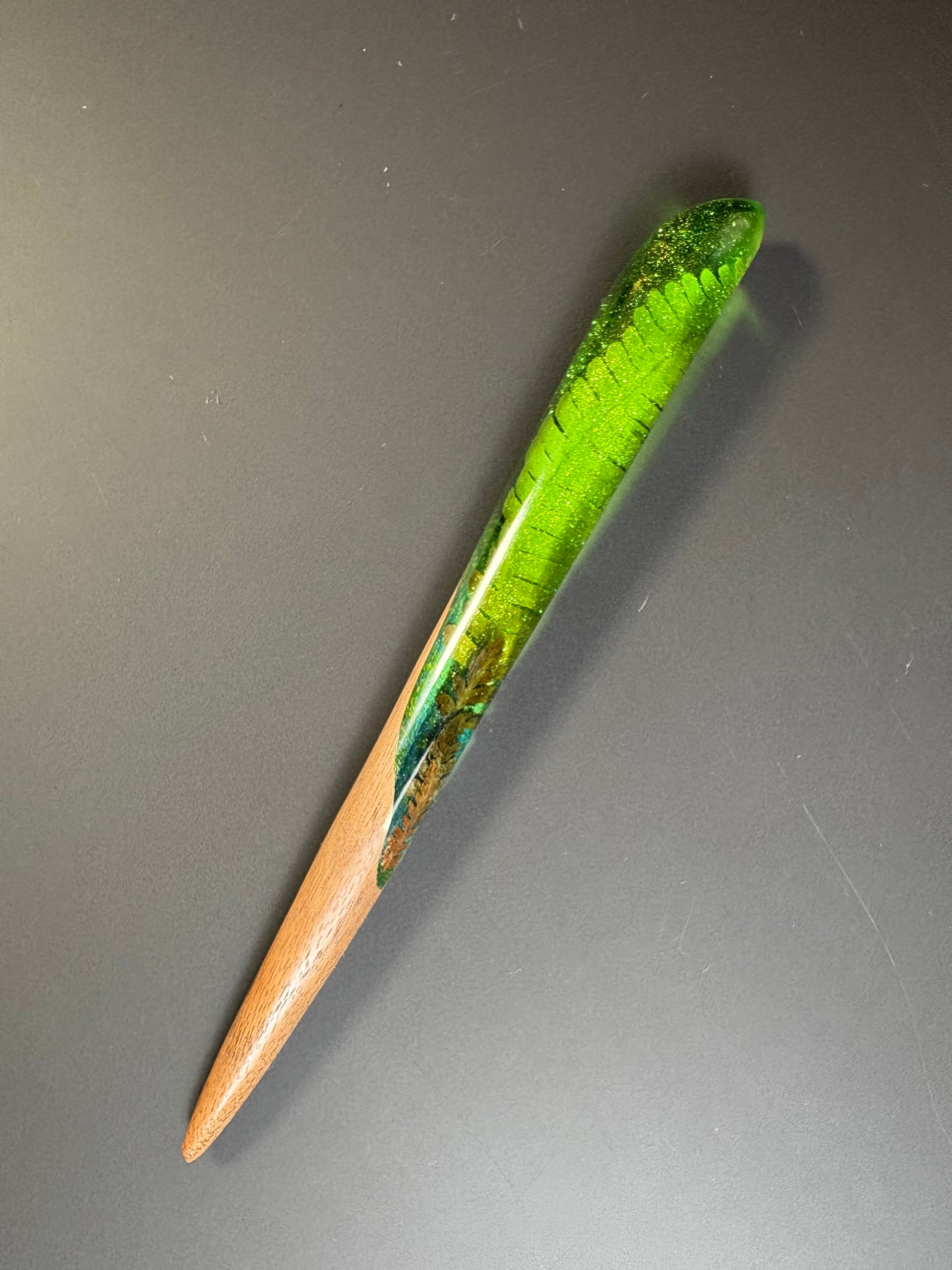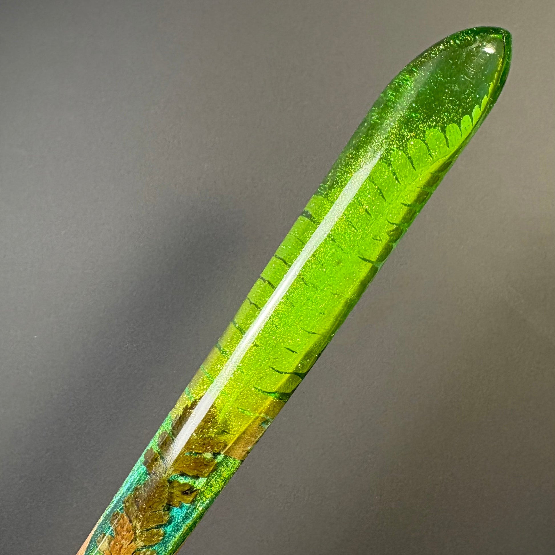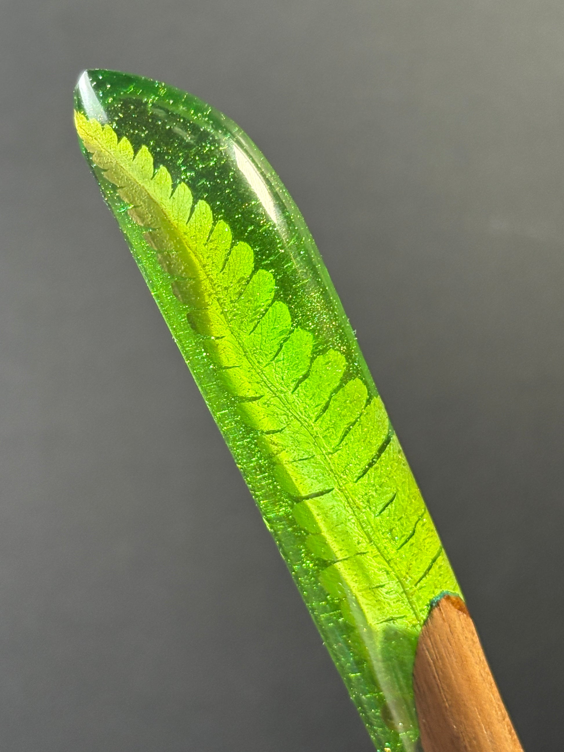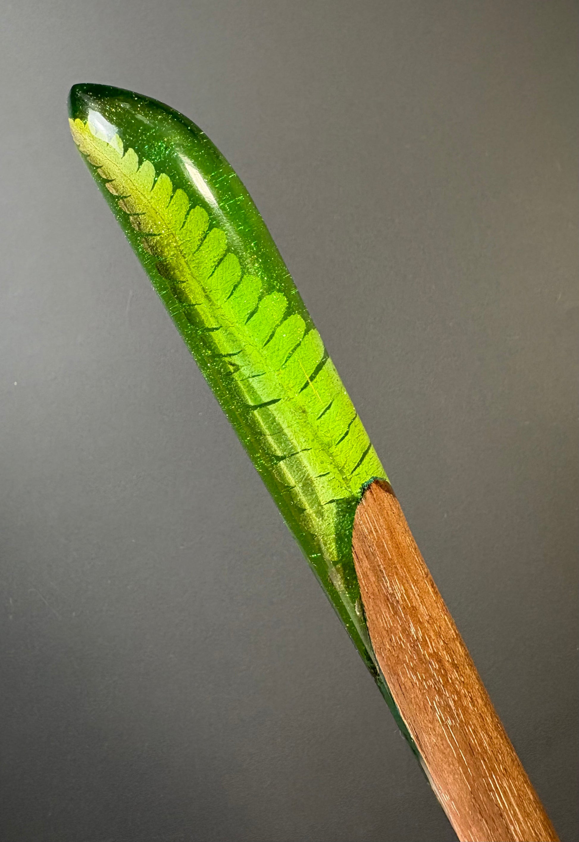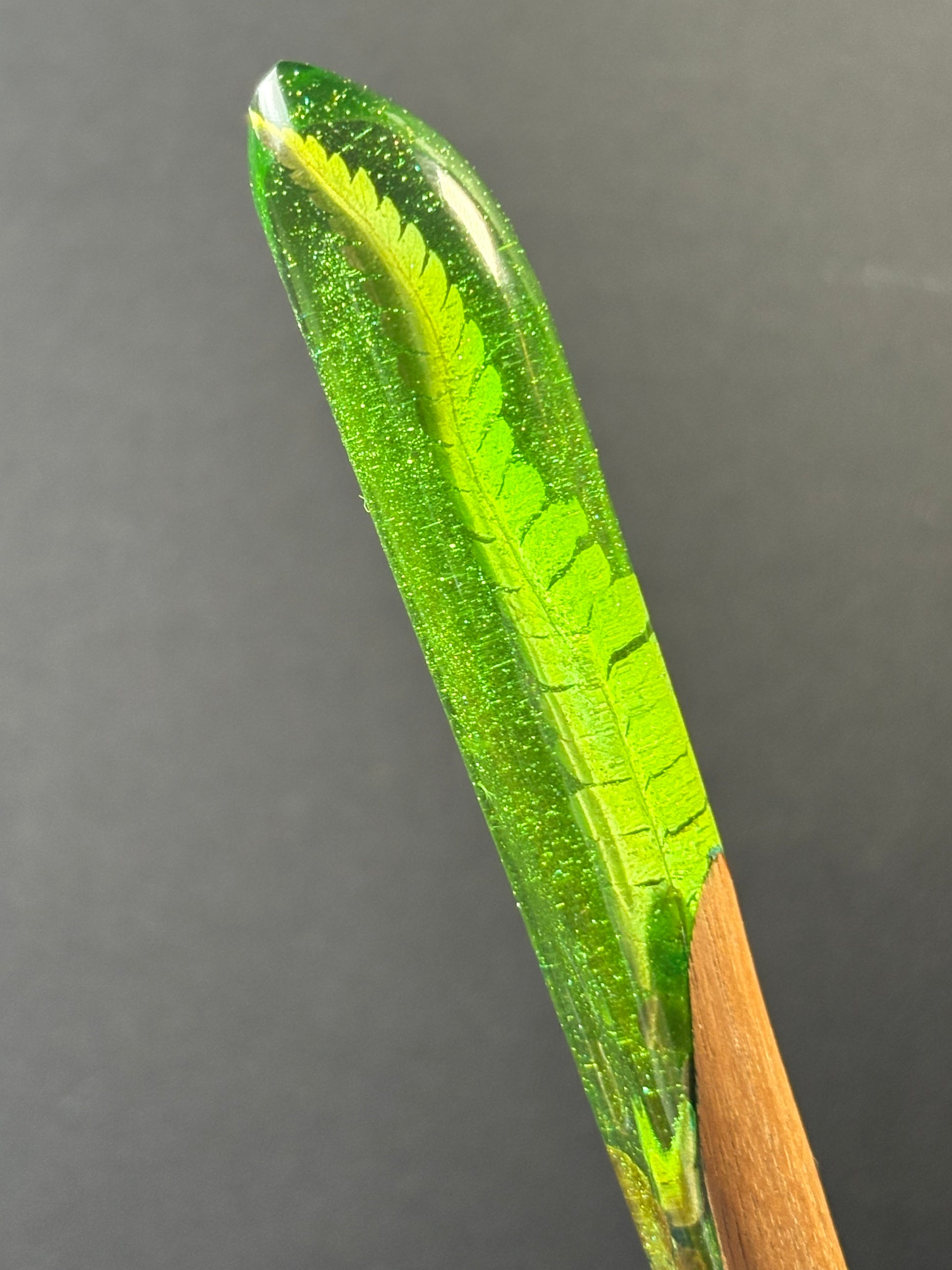 Handmade hair stick inspired by beauty of Irish nature. It is made of resin, walnut wood, fern leaves and mica powders. Resin polished to clear high gloss finish. Wood sealed with Danish oil. Very smooth and nice in touch.