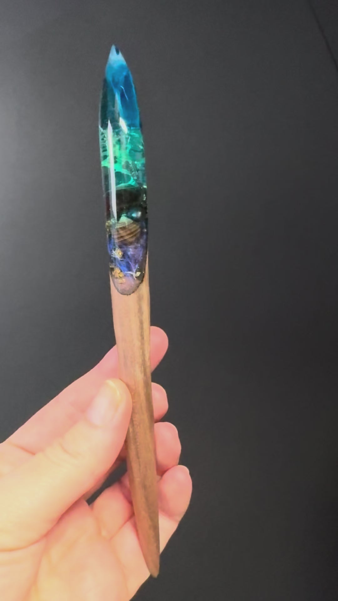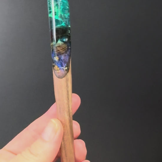 Beautiful Wild Atlantic Way inspired, handmade hair stick is made of resin and walnut wood. It features natural shells, lichen, seaweed, golden glass and real black pearl.
