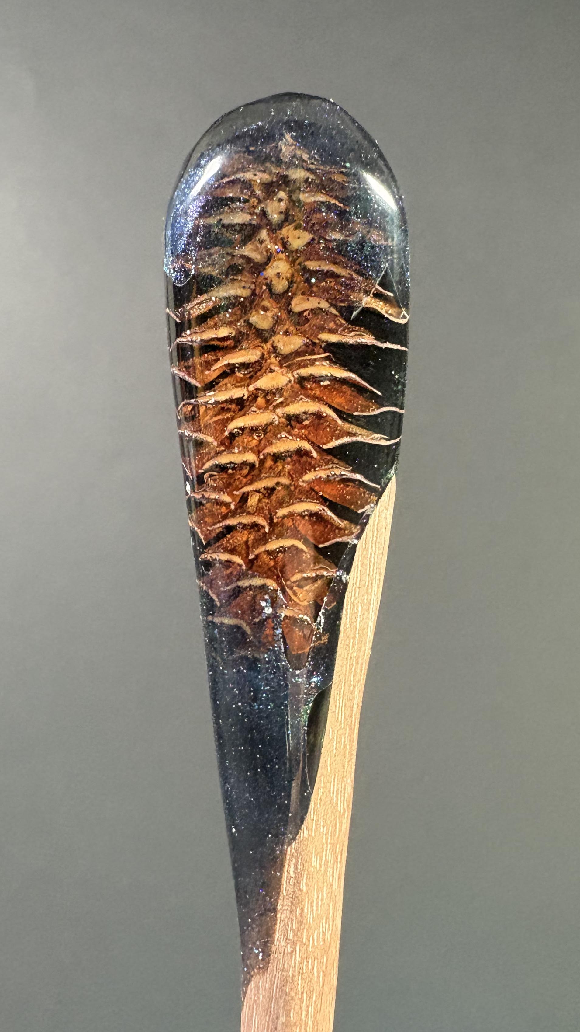 This spruce cone hair stick is a handmade forest-inspired hair accessory made from walnut wood and resin.